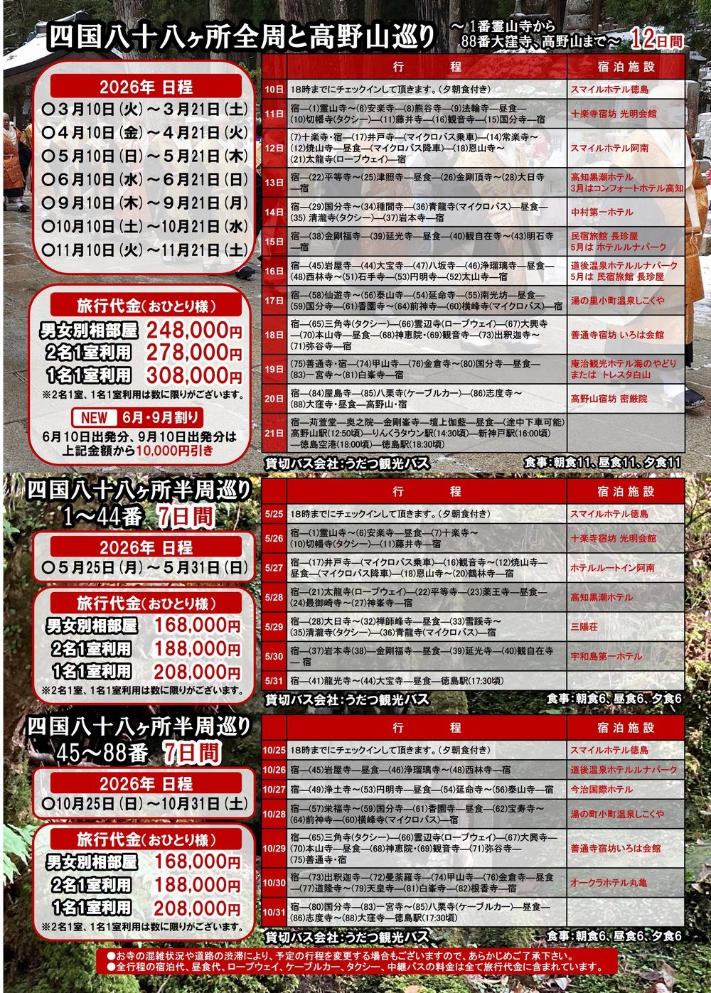 - 添乗員、四国霊場会公認先達が同行します。もちろん納経も代行します。